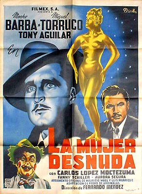 This attractive Mexican movie poster is from a crime melodrama, with film noir overtones. The eye-catching art work features a golden nude woman, two noirish looking men, and a smaller image of a circus clown!... This movie starred Meche Barba, Miguel Torruco, Tony Aguilar, Maria Victoria Gutierrez and Aurora Segura. $75 $55