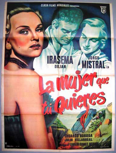 This film noir / crime film poster features several classic elements of the genre -- a beautiful Femme Fatale, troubled lovers and a burning car going over a cliff! Add in lush colors and you have a great onesheet... This movie starred Irasema Dilian, Jorge Mistral, Eduardo Noriega, Tana Lynn and Julio Villarreal. $125 $75