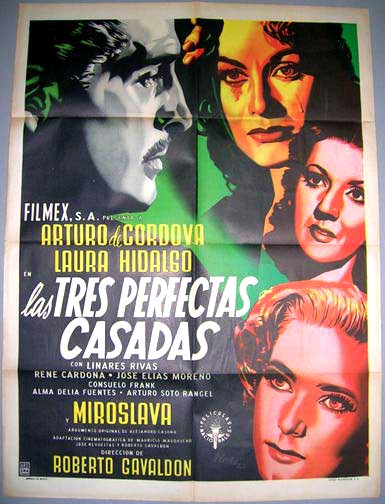 Beautiful Mexican film poster that features a wonder image of de Cordova, who is inspecting the faces of three attractive women. Lovely color and nice Renau style... This movie starred Arturo de Cordova, Laura Hidalgo, Miroslava Stern, Jose Maria Linares-Rivas and Rene Cardona. $85 $55