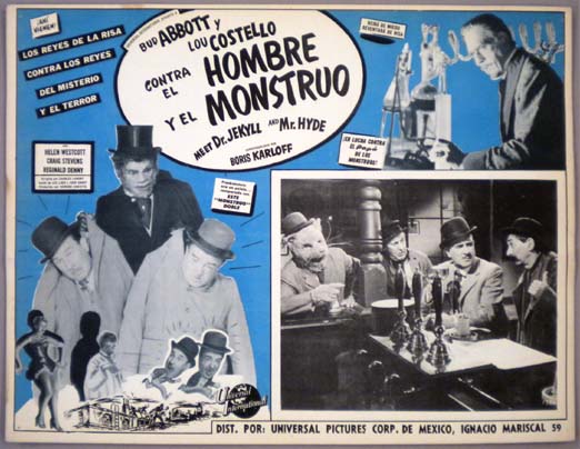 Great Mexican jumbo lobby card (12.5x16.5") from the 1953 Universal comedy / horror / sci-fi film, ABBOTT AND COSTELLO MEET DR. JEKYLL AND MR. HYDE, which starred Bud Abbott, Lou Costello, Boris Karloff, Craig Stevens, Helen Westcott. The film was directed by Charles Lamont. $25 each |