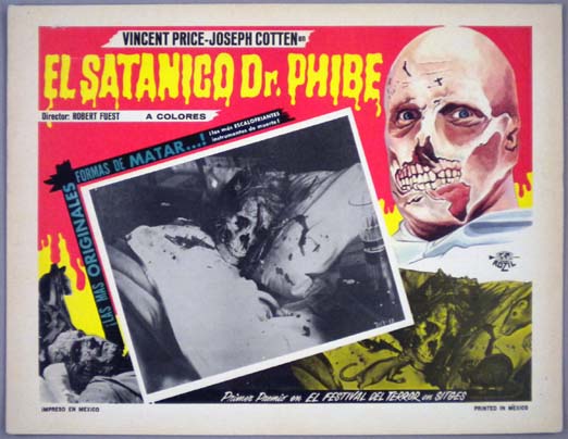 Beautiful Mexican jumbo lobby card (12.5x16.25") from the 1971 AIP horror / black comedy film, THE ABOMINABLE DR. PHIBES, which starred Vincent Price, Joseph Cotten, Virginia North and Terry-Thomas. The film was directed by Robert Fuest. $25 |