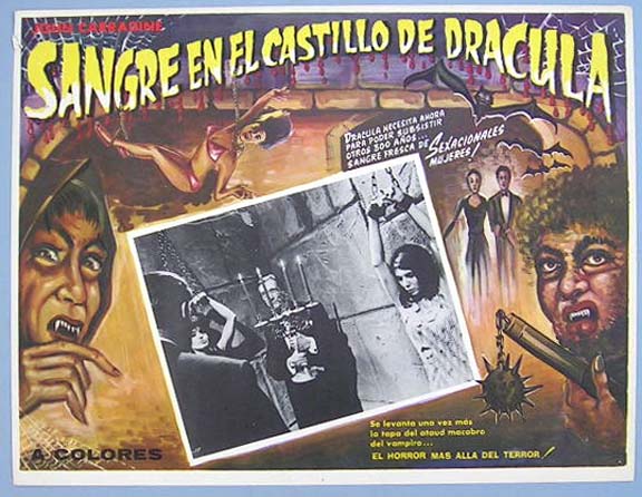 Beautiful Mexican jumbo lobby card (12.5x16.5") from the 1969 Crown Int horror film, BLOOD OF DRACULA'S CASTLE, which starred Alexander D'Arcy, Paula Raymond, Gene O'Shane, Jennifer Bishop, Robert Dix and John Carradine. $20 |