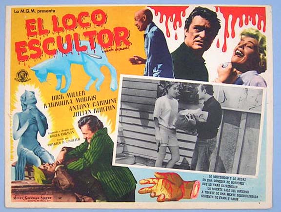 Beautiful Mexican jumbo lobby card (12.5x16.5") from the 1958 AIP horror / comedy film, A BUCKET OF BLOOD, which starred Dick Miller, Barboura Morris, Antony Carbone, Julian Burton and Ed Nelson. The film was directed by Roger Corman and written by Charles B. Griffith. $25 each |