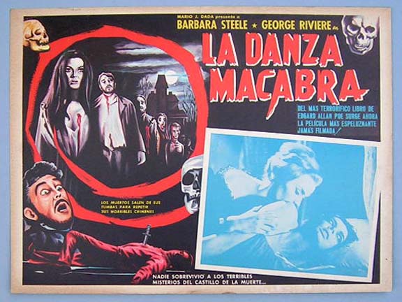 Beautiful Mexican jumbo lobby card (12x16") from the 1964 Italian horror film, CASTLE OF BLOOD, which starred Barbara Steele, Georges Riviere, Margarete Robsahm, Arturo Dominici and Silvano Tranquilli. The film was directed by Antonio Margheriti and is based on a story by Edgar Allan Poe. CASTLE OF BLOOD was released in Italy as, Danza Macabra. $25 each |