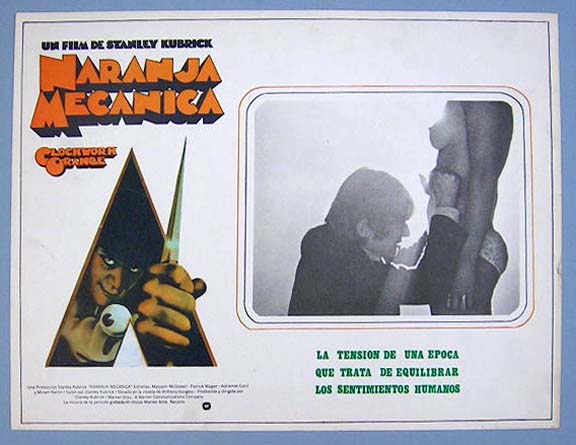 Beautiful Mexican jumbo lobby card (12.5x16.5") from the 1971 Warner Brothers horror / sci-fi film, A CLOCKWORK ORANGE, which starred Malcolm McDowell, Patrick Magee, Michael Bates, Warren Clarke, John Clive and Adrienne Corri. The film was directed by Stanley Kubrick. $25 each |