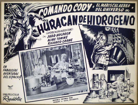 Beautiful Mexican jumbo lobby card (12.5x16.5") from the 1953 Republic sci-fi TV program / theatrical serial, COMMANDO CODY, SKY MARSHALL OF THE UNIVERSE, which starred Judd Holdren, Aline Towne, Gregory Gaye, Richard Crane and William Schallert. This series was originally filmed as a TV program, but was later released theatrically as a 12-chapter serial. It marked the fourth and final appearance of Rocketman -- the sci-fi hero created by Republic Pictures for KING OF THE ROCKETMEN. $25 each |