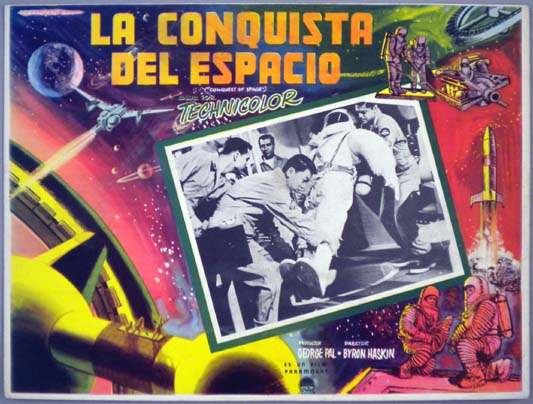 Beautiful Mexican jumbo lobby card (12.5x16.5") from the 1955 Paramount sci-fi film, CONQUEST OF SPACE, which starred Walter Brooke, Eric Fleming, Mickey Shaughnessy, Phil Foster, William Redfield, William Hopper, Benson Fong and Ross Martin. $25 |