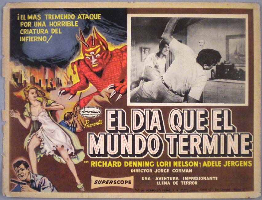 Beautiful Mexican jumbo lobby card (12.75x17") from the 1956 AIP / American Releasing sci-fi / monster film, THE DAY THE WORLD ENDED, which starred Richard Denning, Lori Nelson, Adele Jergens and Mike Connors. There is some wear along the borders, but this does not affect the great image area. Otherwise, the card is in great shape. $65 |