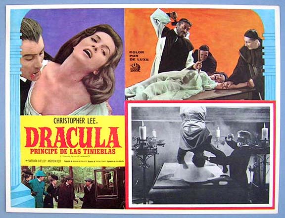 Beautiful Mexican jumbo lobby card (12.5x16.5") from the 1966 Hammer vampire / horror film, DRACULA PRINCE OF DARKNESS, which starred Christopher Lee, Barbara Shelley, Andrew Keir, Francis Matthews and Suzan Farmer. $25 each |