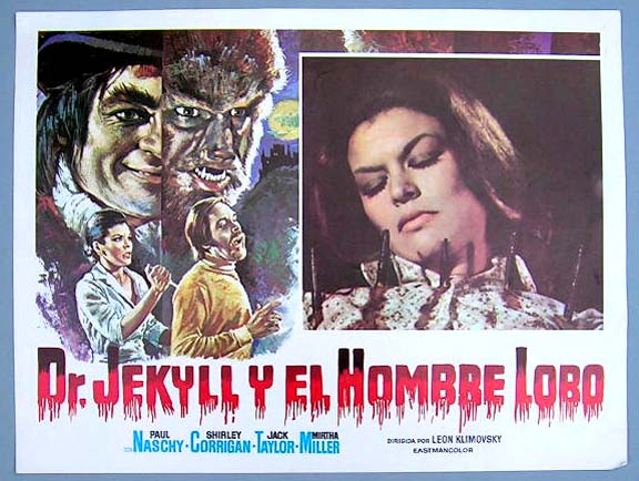 Beautiful Mexican jumbo lobby card (13x17") from the 1972 Spanish horror / sci-fi film, DR. JEKYLL AND THE WEREWOLF, which starred Paul Naschy, Shirley Corrigan, Jack Taylor, Mirta Miller and Jose Marco. $20 each |