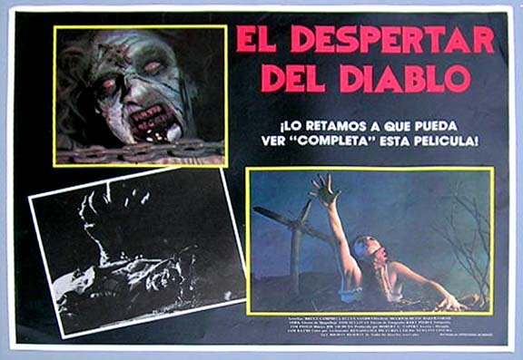 Beautiful Mexican jumbo lobby card (12.5x16.5") from the 1981 New Line horror film, THE EVIL DEAD, which starred Bruce Campbell, Ellen Sandweiss, Richard DeManincor, Betsy Baker and Theresa Tilly. The film was directed by Sam Raimi. These glossy cards are printed on thinner paper than usual for typical Mexican lobby cards. $25 each |