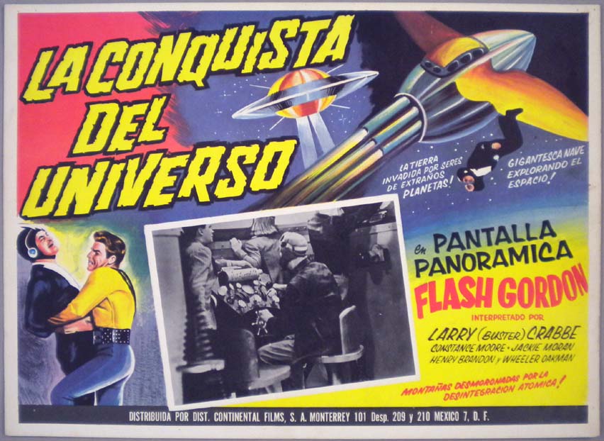 Beautiful Mexican jumbo lobby card (12x16.5") from the 1940 Universal sci-fi serial, FLASH GORDON CONQUERS THE UNIVERSE, which starred Buster Crabbe, Carol Hughes, Charles Middleton, Anne Gwynne and Frank Shannon. $45 |