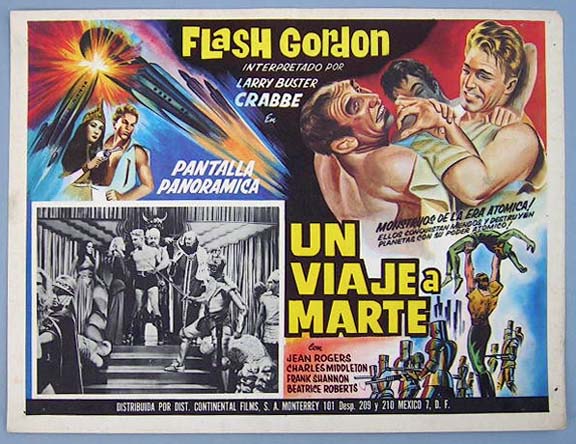 Beautiful Mexican jumbo lobby card (12.5x16.5") from the 1938 Universal sci-fi serial, FLASH GORDON'S TRIP TO MARS, which starred Buster Crabbe, Jean Rogers, Charles Middleton, Frank Shannon, Beatrice Roberts, Donald Kerr, Richard Alexander and C. Montague Shaw. $35 each |