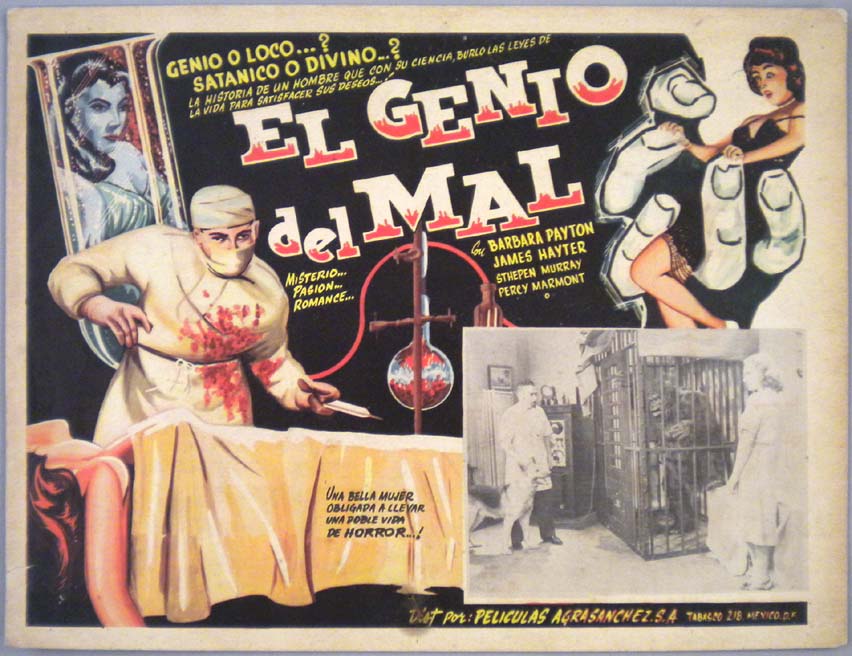 Beautiful Mexican jumbo lobby card (12.75x16.75") from the 1953 Hammer / British sci-fi film, THE FOUR-SIDED TRIANGLE, which starred Barbara Payton, James Hayter, Stephen Murray and John Van Eyssen. This card may have been done by Aguirre, although it is not signed by the artist. $35 |