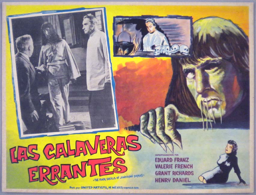 Beautiful Mexican jumbo lobby card (12.5x16.25") from the 1959 United Artists horror / monster film, THE FOUR SKULLS OF JONATHAN DRAKE, which starred Henry Daniell, Valerie French, Grant Richards, Eduard Franz and Lumsden Hare. $35 |