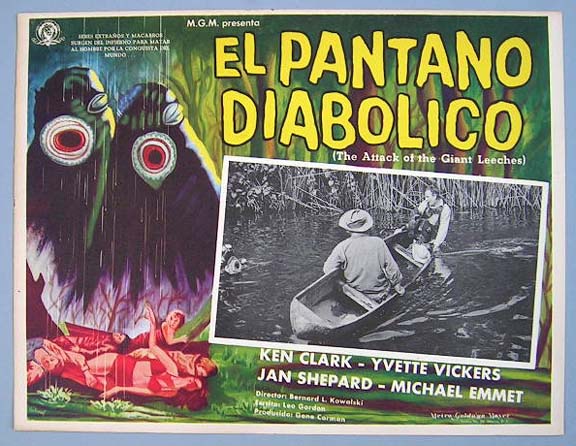 Beautiful Mexican jumbo lobby card (13x16.5") from the 1963 independent sci-fi / monster film, THE SLIME PEOPLE, which starred Robert Hutton, Les Tremayne, Susan Hart, Robert Burton and William Boyce. The artwork makes the monsters look very much like the "Creature from the Black lagoon." $35 each |