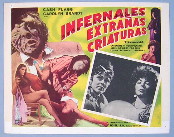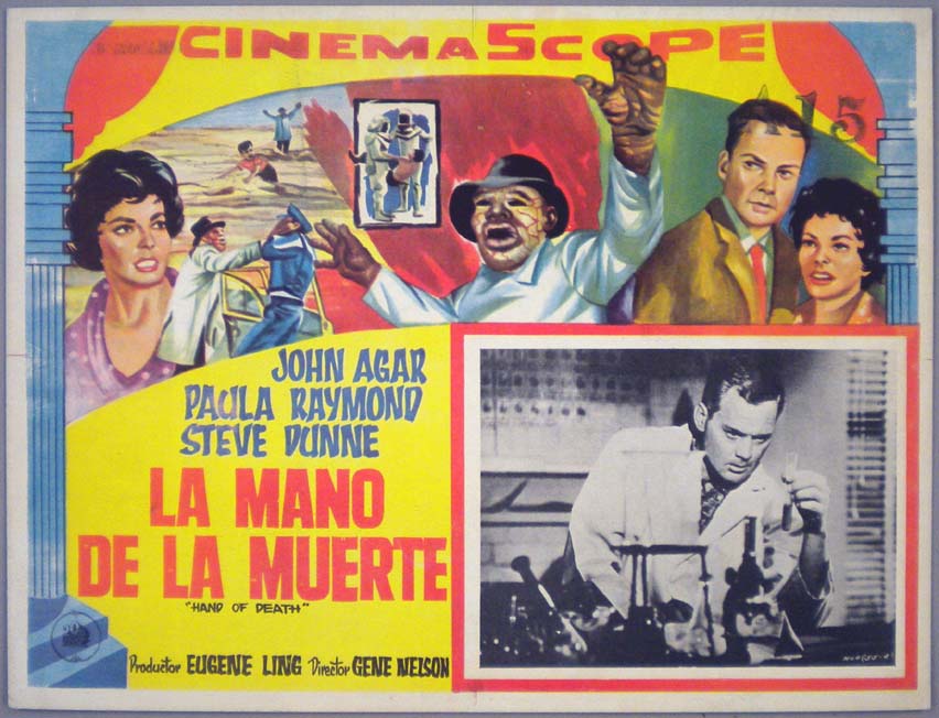 Beautiful Mexican lobby card (11x14") from the 1965 Essen Prod. horror / sci-fi film, STING OF DEATH, which starred Joe Morrison, Valerie Hawkins, John Vella, Jack Nagle, Sandy Lee Kane and Deanna Lund. $25 |