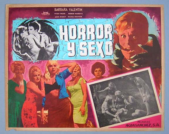 Beautiful Mexican jumbo lobby card (12x15.5") from the 1962 Italian horror film, THE PLAYGIRLS AND THE VAMPIRE, which starred Walter Brandi, Lila Rocco, Alfredo Rizzo and Maria Giovannini. Notice how they made the vampire look like German Robles, to try to attract a biggest Mexican audience. $20 each |