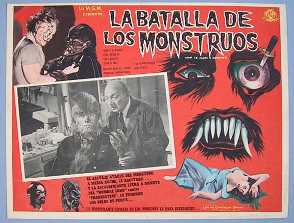 Beautiful Mexican jumbo lobby card (12.25x16.5") from the 1941 Universal horror / monster film, THE WOLF MAN, which starred Lon Chaney Jr., Claude Rains, Warren William, Ralph Bellamy, Patric Knowles, Bela Lugosi, Maria Ouspenskaya and Evelyn Ankers. This rare card is likely from the 1950s reissue of the film. There is a inked '2' handwritten on the background portion of the inset scene -- but this flaw does not detract from the main art work. Otherwise, the card is in great shape. $150 |