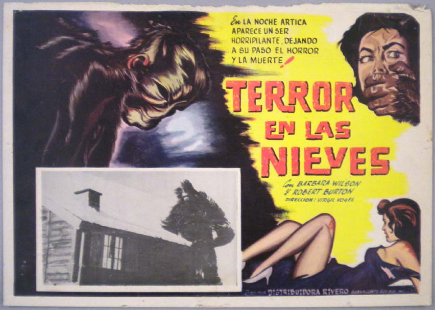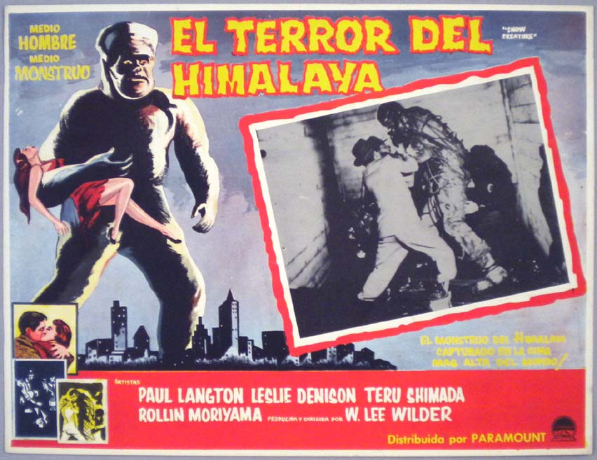 Beautiful Mexican jumbo lobby card (11x14.5") from the 1954 United Artists sci-fi / monster / yeti film, SNOW CREATURE, which starred Paul Langton, Leslie Denison, Teru Shimada, Rollin Moriyama and Robert Kino. $25 |