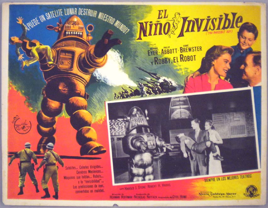 Beautiful Mexican jumbo lobby card (12.5x16.5") from the 1956 MGM sci-fi film, FORBIDDEN PLANET, which starred Walter Pidgeon, Anne Francis, Leslie Nielsen, Warren Stevens, Jack Kelly, Richard Anderson, Earl Holliman and Robby the Robot. $150 each |