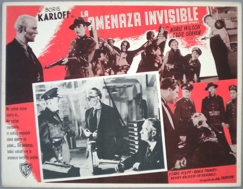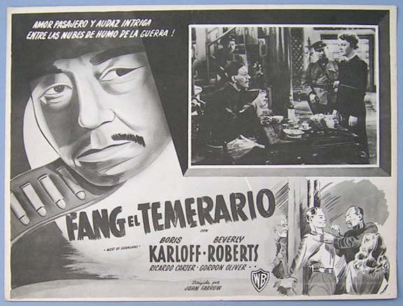 Great Mexican jumbo lobby card (12.5x16.5") from the 1937 First National adventure / war film, WEST OF SHANGHAI, which starred Boris Karloff, Beverly Roberts, Ricardo Cortez, Gordon Oliver, Sheila Bromley and Vladimir Sokoloff. $15 each |