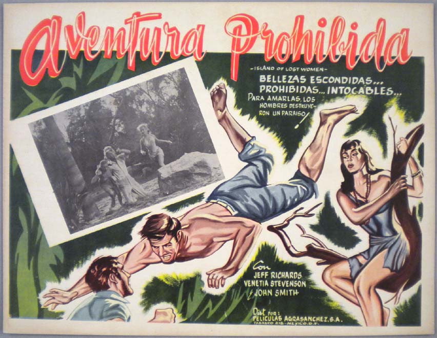 Beautiful Mexican jumbo lobby card (12.5x16") from the 1952 independent sci-fi / caveman / dinosaur film, UNTAMED WOMEN, which starred Mikel Conrad, Doris Merrick, Richard Monahan, Morgan Jones and Midge Ware. $65 |