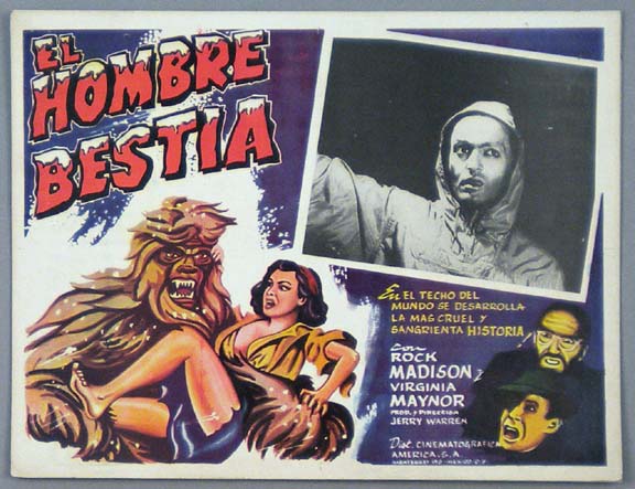 Beautiful Mexican jumbo lobby card (12.5x16.5") from the 1958 AIP Sci-fi film, WAR OF THE COLOSSAL BEAST, which starred Sally Fraser, Roger Pace, Duncan 'Dean' Parkin and Russ Bender. The movie, which was directed by Bert I. Gordon, was the sequel to the cult classic, THE AMAZING COLOSSAL MAN. $45 each |