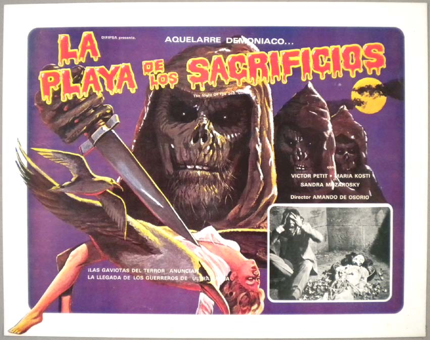 Beautiful Mexican jumbo lobby card (12x15.5") from the 1972 Spanish horror / zombie film, THE TOMB OF THE BLIND DEAD, which starred Lone Fleming, Cesar Burner, Maria Elena Arpon and Jose Thelman. The film was directed by Amando de Ossorio. This was the first film in the BLIND DEAD series! $35 |
