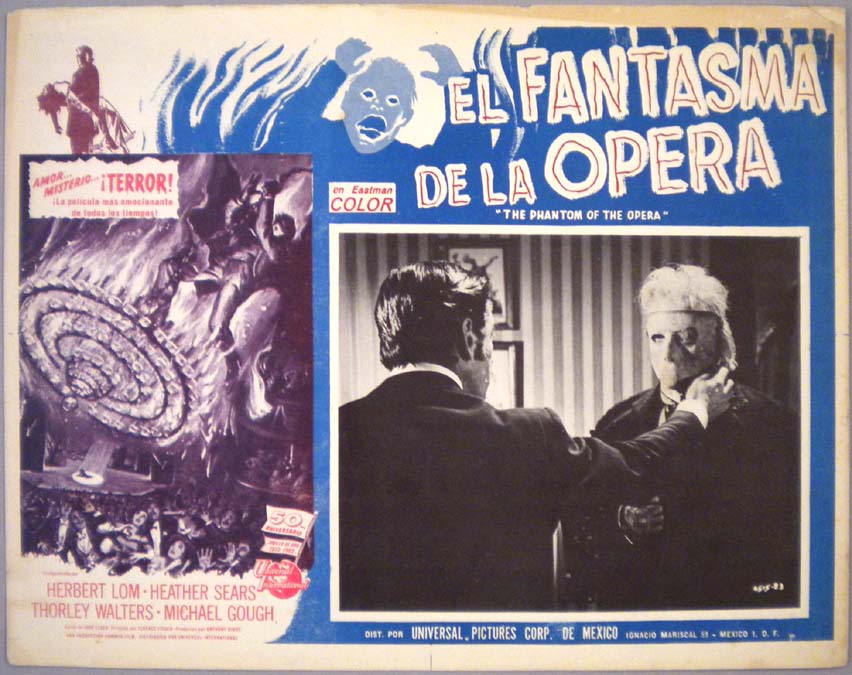 Classic Mexican jumbo lobby card (12.75x16") from the 1962 Hammer / Universal horror film, THE PHANTOM OF THE OPERA, which starred Herbert Lom, Heather Sears, Thorley Walters and Michael Gough. The film was directed by Terence Fisher. $25 |