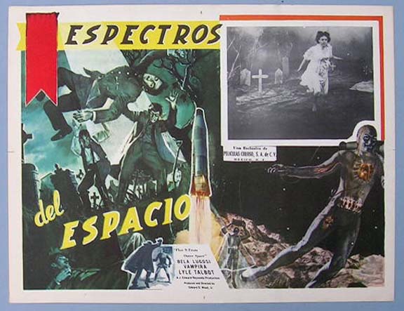 Great Mexican jumbo lobby card (12.5x16.5") from the 1959 DCA cult sci-fi film, PLAN NINE FROM OUTER SPACE, which starred Bela Lugosi, Vampira, Tor Johnson, Criswell, Gregory Walcott, Mona McKinnon, Duke Moore, Tom Keene, Carl Anthony, Paul Marco, Dudley Manlove, Joanna Lee, John Breckinridge and Lyle Talbot. The film was directed by Edward D. Wood Jr. $95 each |