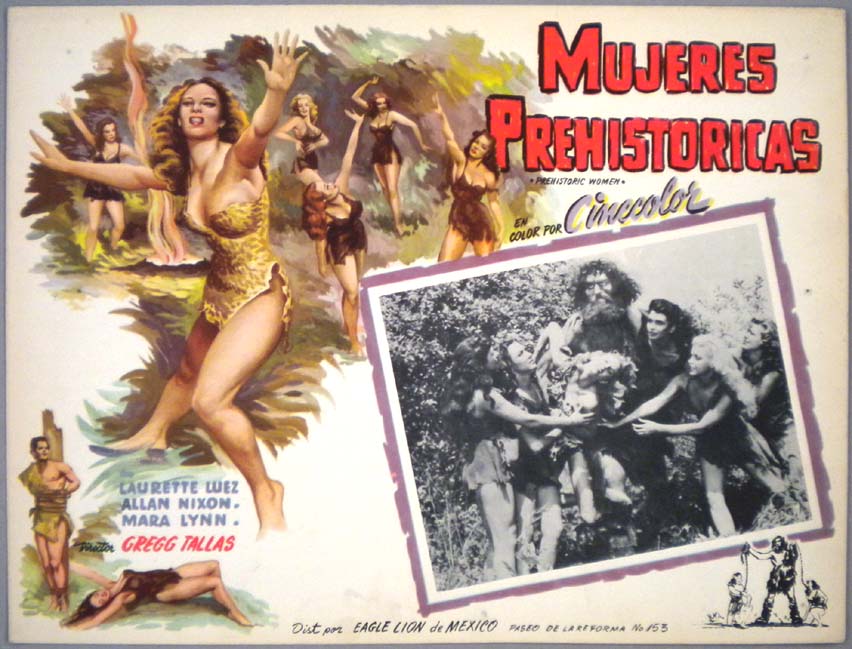 Beautiful Mexican jumbo lobby card (12.5x16.5") from the 1950 Eagle Lion sci-fi / caveman film, PREHISTORIC WOMEN, which starred Laurette Luez, Allan Nixon, Joan Shawlee, Judy Landon and Mara Lynn. This card features some of the best art of any Mexican cards! $65 |
