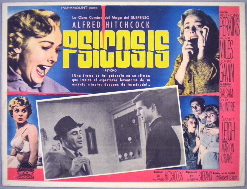 Beautiful Mexican jumbo lobby card (12.5x16.5") from the 1960 Paramount suspense / horror film, PSYCHO, which starred Anthony Perkins, Janet Leigh, Vera Miles, John Gavin, Martin Balsam and John McIntire. The film was directed by Alfred Hitchcock. $55 each |
