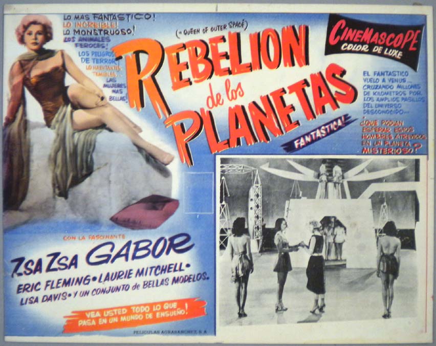 Beautiful Mexican jumbo lobby card (12x15.25") from the 1958 Allied Artists sci-fi film, QUEEN OF OUTER SPACE, which starred Zsa Zsa Gabor, Eric Fleming, Dave Willock, Laurie Mitchell and Lisa Davis. The card does not have a left border, but this was just the way it was produced. $25 |
