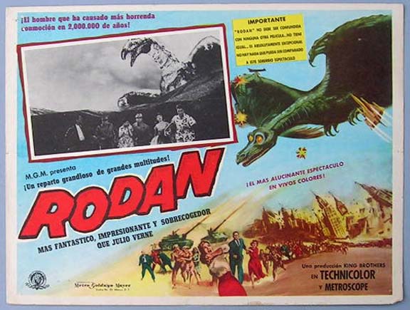 Beautiful Mexican jumbo lobby card (12.5x16.5") from the 1957 Toho / Japanese sci-fi film, RODAN, which starred Kenji Sahara, Yumi Shirakawa, Akihiko Hirata, Akio Kobori, Minosuke Yamada and Ren Imaizumi. The film was directed by Ishiro Honda. Rodan was originally released in Japan as, Sora no Daikaiju Radon. $35 each |