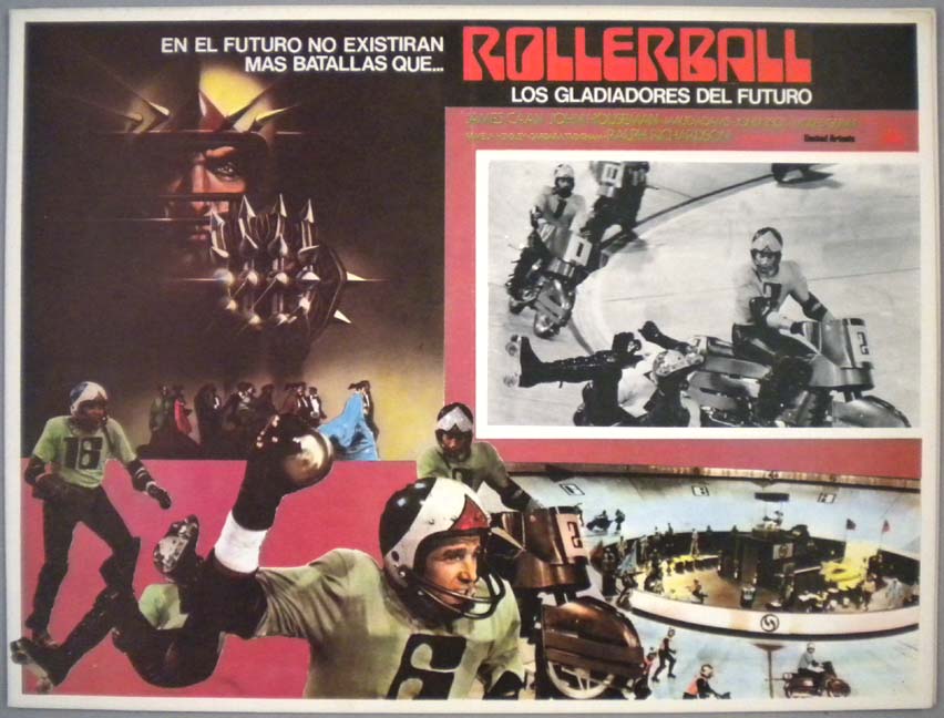 Beautiful Mexican jumbo lobby card (12.5x16.25") from the 1975 United Artists sci-fi motorcycle / roller derby film, ROLLERBALL, which starred James Caan, John Houseman, Maud Adams, John Beck and Moses Gunn. There is a crease near the lower left corner, but otherwise, the card is in great shape. $20 each |