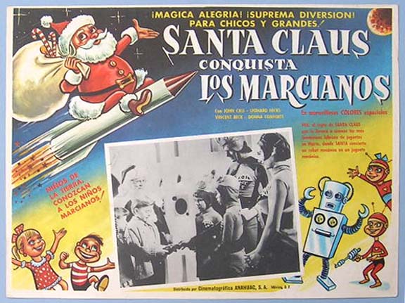 Beautiful Mexican jumbo lobby card (12.5x16.5") from the 1964 independent sci-fi / fantasy / robot film, SANTA CLAUS CONQUERS THE MARTIANS, which starred John Call, Leonard Hicks, Vincent Beck, Bill McCutcheon and Pia Zadora. $35 each |