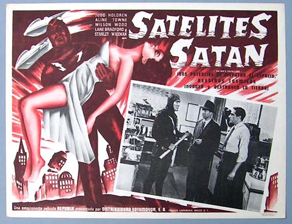 Beautiful Mexican jumbo lobby card (12.5x16.5") from the 1958 Republic sci-fi / robot film, SATAN'S SATELLITES, which starred George Wallace, Aline Towne, Roy Barcroft, William Blakewell and Clayton Moore. SATAN'S SATELLITES was the feature film version of the 1952 Republic serial, ZOMBIES OF THE STRATOSPHERE. $25 each |