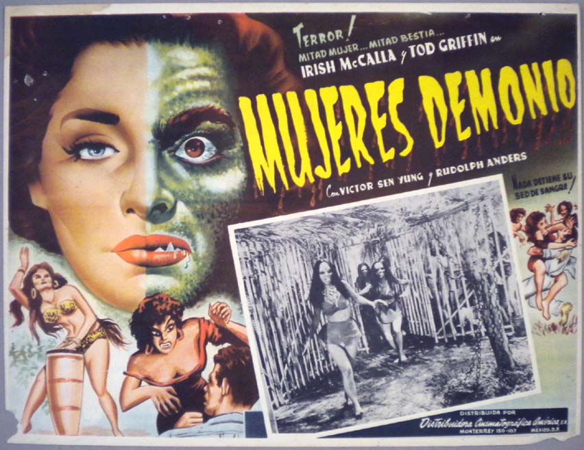 Beautiful Mexican jumbo lobby card (12.5x16") from the 1958 Astor sci-fi / monster / horror film, SHE DEMONS, which starred Irish McCalla, Tod Griffin, Victor Sen Yung, Rudolph Anders, Gene Roth and Leni Tana. There are some dings/wear along the edges, but otherwise, the card is in pretty nice shape. $35 |