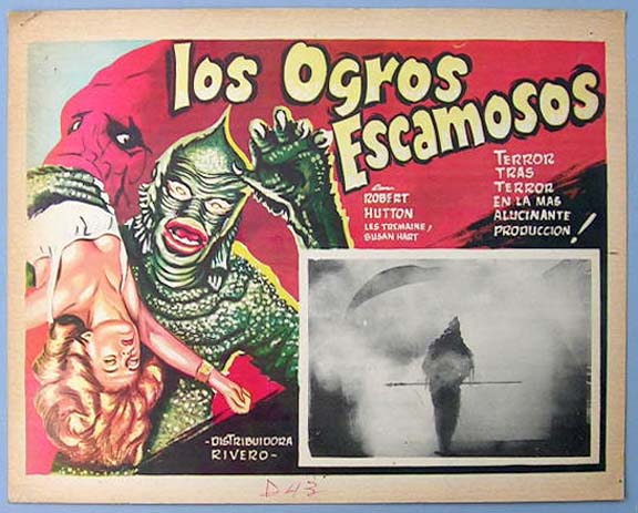 Original Mexican jumbo lobby card (12.5x16.5") from the 1956 Universal sci-fi / monster film, THE CREATURE WALKS AMONG US, which starred Jeff Morrow, Rex Reason, Leigh Snowden, Gregg Palmer and Maurice Manson. THE CREATURE WALKS AMONG US was the third film in the Creature from the Black Lagoon monster film series. $45 each |