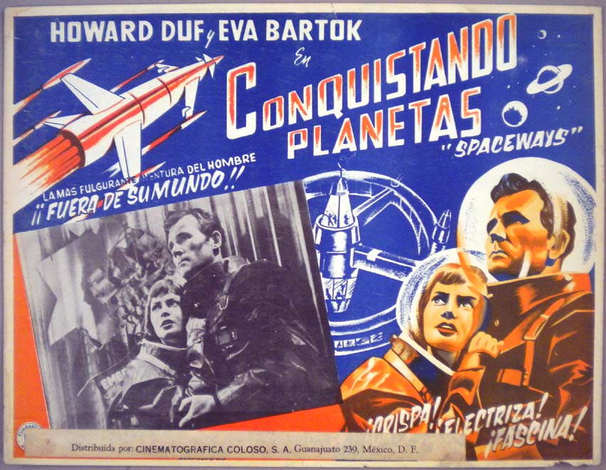 Beautiful Mexican jumbo lobby card (12.25x16") from the 1953 Lippert sci-fi film, SPACEWAYS, which starred Howard Duff, Eva Bartok, Alan Wheatley, Philip Leaver, Michael Medwin. The film was directed by Terence Fisher. $35 |