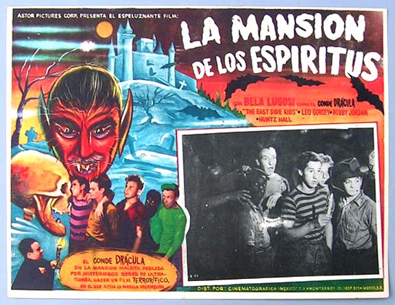 Beautiful Mexican jumbo lobby card (12.5x16.5") from the 1941 Monogram comedy / horror film, SPOOKS RUN WILD, which starred Bela Lugosi, Leo Gorcey, Bobby Jordan, Huntz Hall, Sunshine Sammy Morrison, Dave O'Brien, Dorothy Short, David Gorcey and Angelo Rossitto. The film was part of the Bowery Boys / East Side Kids / Dead End Kids series. $35 each |