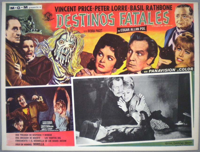 Beautiful Mexican jumbo lobby card (12.75x16.75") from the 1962 AIP horror / comedy film, TALES OF TERROR, which starred Vincent Price, Peter Lorre, Basil Rathbone, Joyce Jameson, Debra Paget. The film was directed by Jack Arnold. $25 each |
