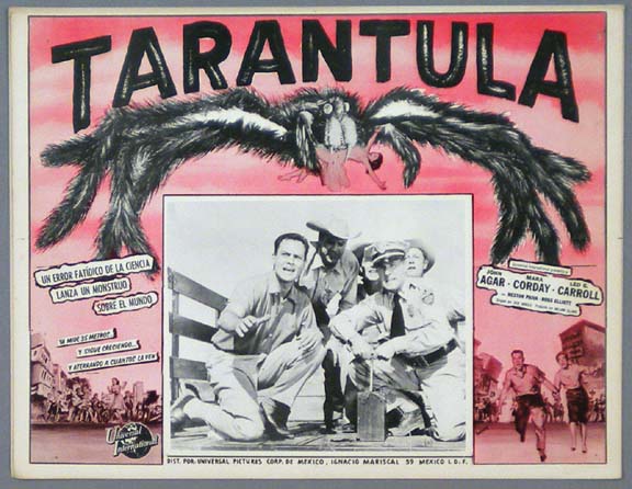 Classic Mexican jumbo lobby card (12.75x16.5") from the 1955 Universal sci-fi / monster film, TARANTULA, which starred John Agar, Mara Corday, Leo G. Carroll, Nestor Paiva, Ross Elliott and Clint Eastwood. The film was directed by Roger Corman and was based on stories by Edgar Allan Poe. $35 each |
