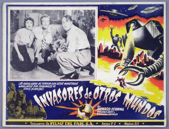 Beautiful Mexican jumbo lobby card (12.5x16.5") from the 1953 Paramount sci-fi film, WAR OF THE WORLDS, which starred Gene Barry, Ann Robinson, Les Tremayne, Lewis Martin and Robert Cornthwaite. The movie was produced by George Pal, and was based on a story by H.G. Wells. The mexican lobby card set has far better scenes than the USA set, including a close-up of the alien and several cards picturing the Martian flying saucers. Martian card - $250 ... Saucer scenes $150 each ... Other cards - $95 each |