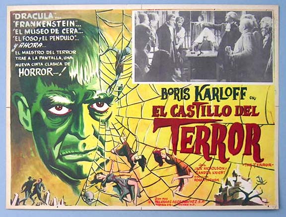 Beautiful Mexican jumbo lobby card (12.5x16.5") from the 1963 AIP Gothic horror film, THE TERROR, which starred Boris Karloff, Jack Nicholson, Sandra Knight, Dick Miller and Jonathan Haze. The film was directed by Roger Corman. Although the border art and film info is all for 'The Terror,' the inset-scenes are all from the Val Lewton horror movie, 'Bedlam.' $20 each |