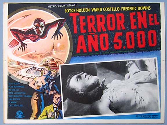 Beautiful Mexican jumbo lobby card (12.5x16.5") from the 1958 AIP sci-fi film, TERROR FROM YEAR 5000, which starred Ward Costello, Joyce Holden, Frederic Downs, John Stratton and Salome Jens. $35 each |