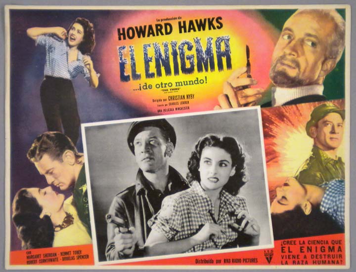 Beautiful Mexican jumbo lobby card (12.5x16.5") from the 1951 RKO sci-fi / monster film, THE THING, which starred Kenneth Tobey, Margaret Sheridan, Robert Cornthwaite, Douglas Spencer, James Arness, Dewey Martin and George Fenneman. This is from the rare, RKO, first issue of the film. $150 |