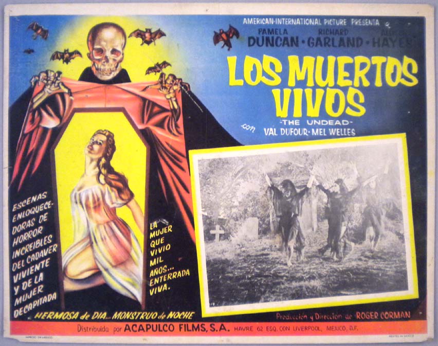 Beautiful Mexican lobby card (11x14") from the 1957 AIP horror film, THE UNDEAD, which starred Pamela Duncan, Richard Garland, Allison Hayes, Val Dufour, Mel Welles, Billy Barty and Bruno VeSota. The film was directed by Roger Corman. $65 |