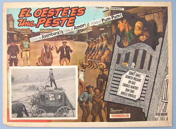 Beautiful Mexican jumbo lobby card (12.5x16.5") from the 1966 British comedy / western film, CARRY ON COWBOY, which starred Sid James, Kenneth Williams, Jim Dale, Charles Hawtrey, Joan Sims and Angela Douglas. $20 each |